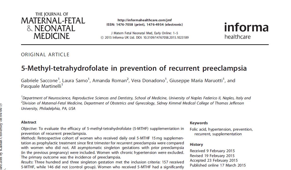 Un italiano de 2015 estudio de cohorte retrospectivo (n = 303 mujeres con preeclampsia previa) mostró que 15 mg de 5-MTHF al día desde el primer trimestre redujeron la recurrencia general de preeclampsia de 39,7 % a 21,7 % (OR 0,57, IC 95 % 0,25-0,69), grave preeclampsia de 8,9 % a 3,2 % (OR 0,44, IC 95 % 0,12-0,97), y de aparición temprana preeclampsia del 7,5 % al 1,9 % (OR 0,34; IC del 95 %: 0,07 a 0,87) [2].