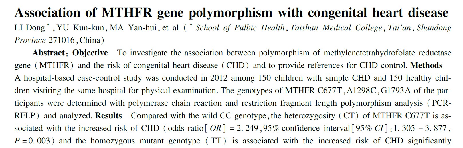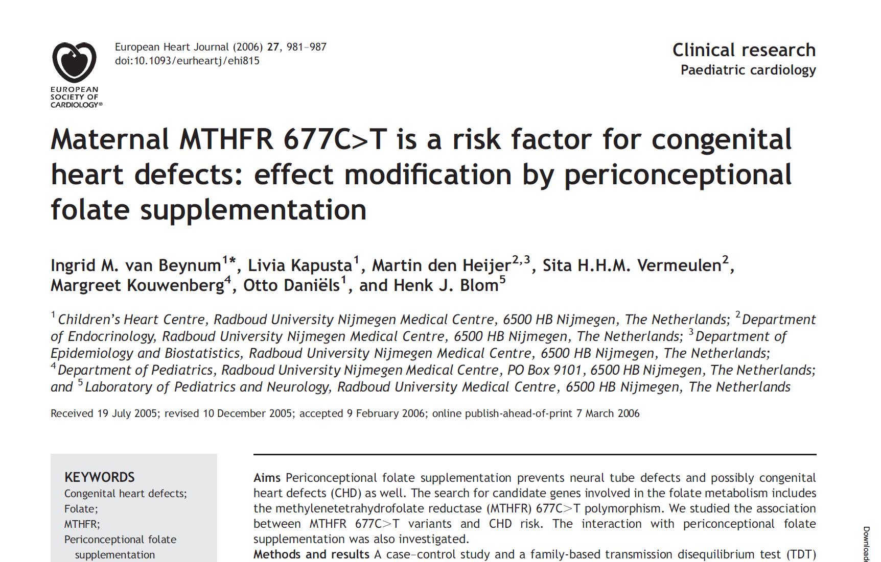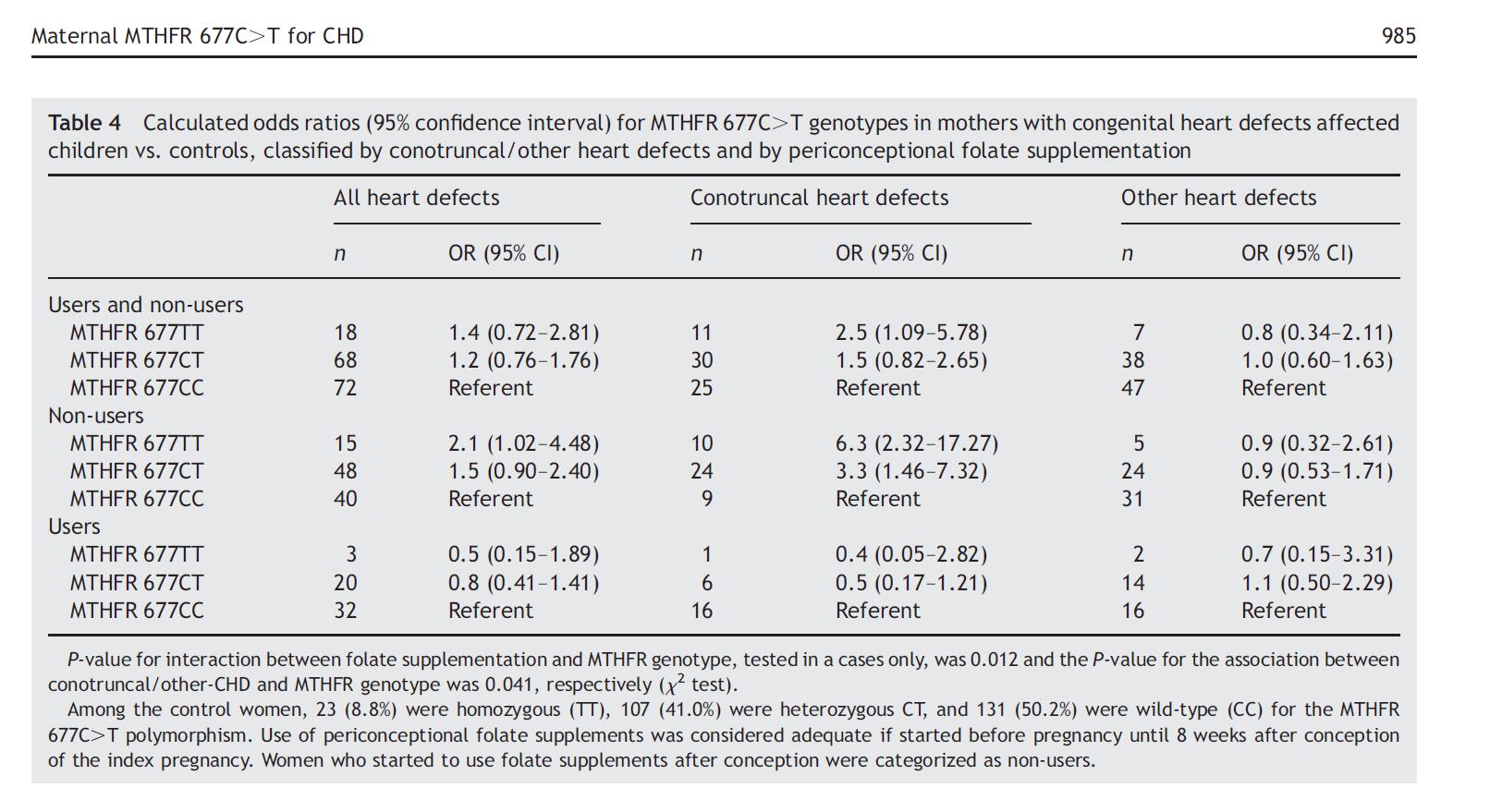 Entre 165 familias con enfermedades congénitas enfermedad cardíaca (CHD) y 220 familias de control, madres que portaban el MTHFR 677 genotipo CT o TT y NO habían tomado suplementos de folato periconcepcional fueron Es mucho más probable que tenga un hijo con defectos cardíacos de conducción (OR 3,3 y 6.3, respectivamente).