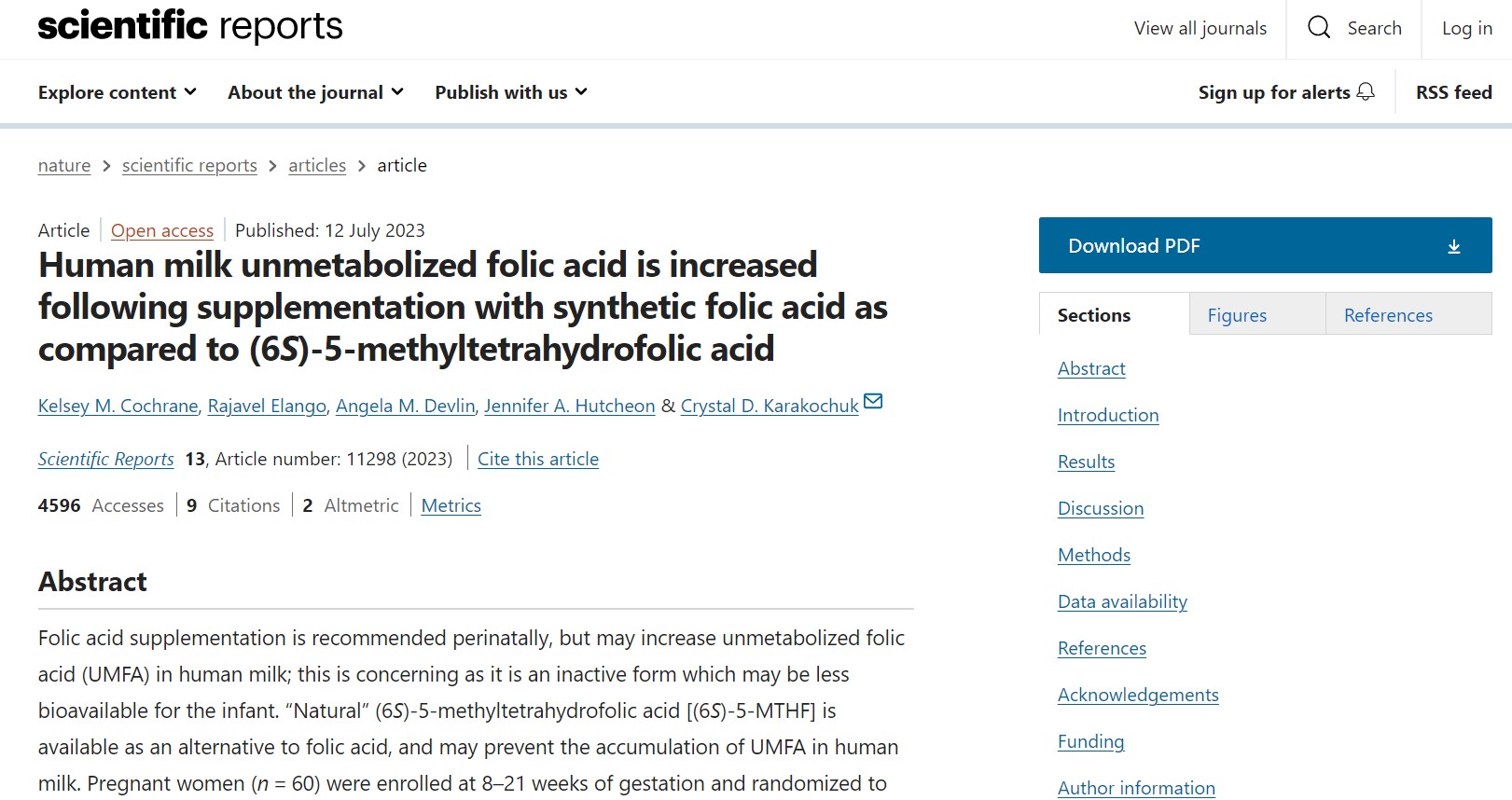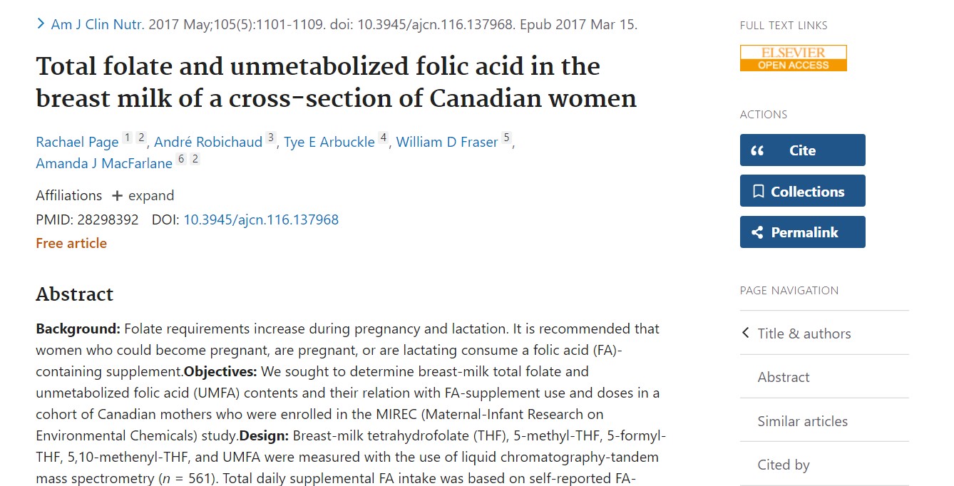 Página R et al. Folato total y ácido fólico no metabolizado en la leche materna de mujeres canadienses. Am J Clin Nutr 2017;105:1101-9.