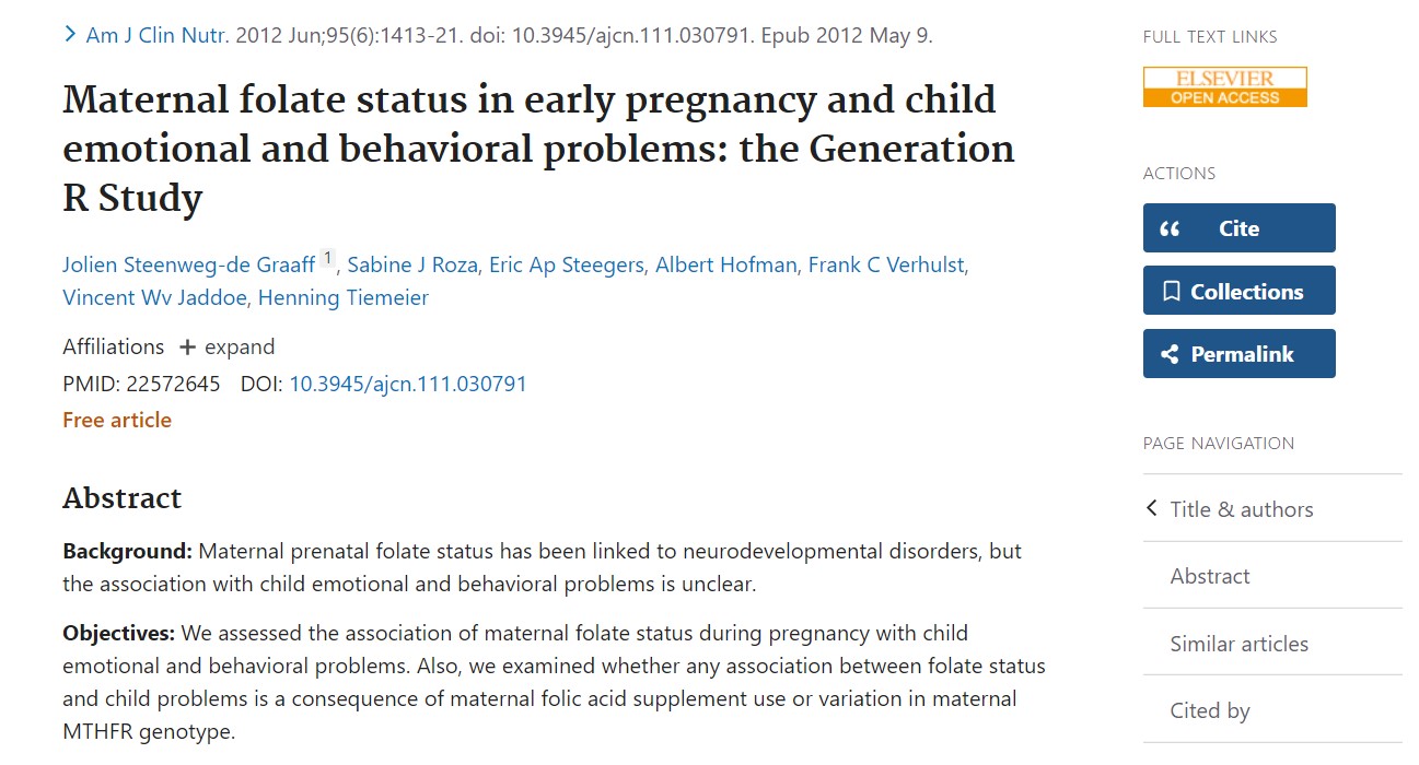 Este estudio, conocido como estudio de cohorte Generación R y publicado en la autoridadRevista Americana de Nutrición Clínica, destacó un asociación entre el folato y el desarrollo emocional de los niños, distinta de su conocido papel en la prevención de defectos del tubo neural.