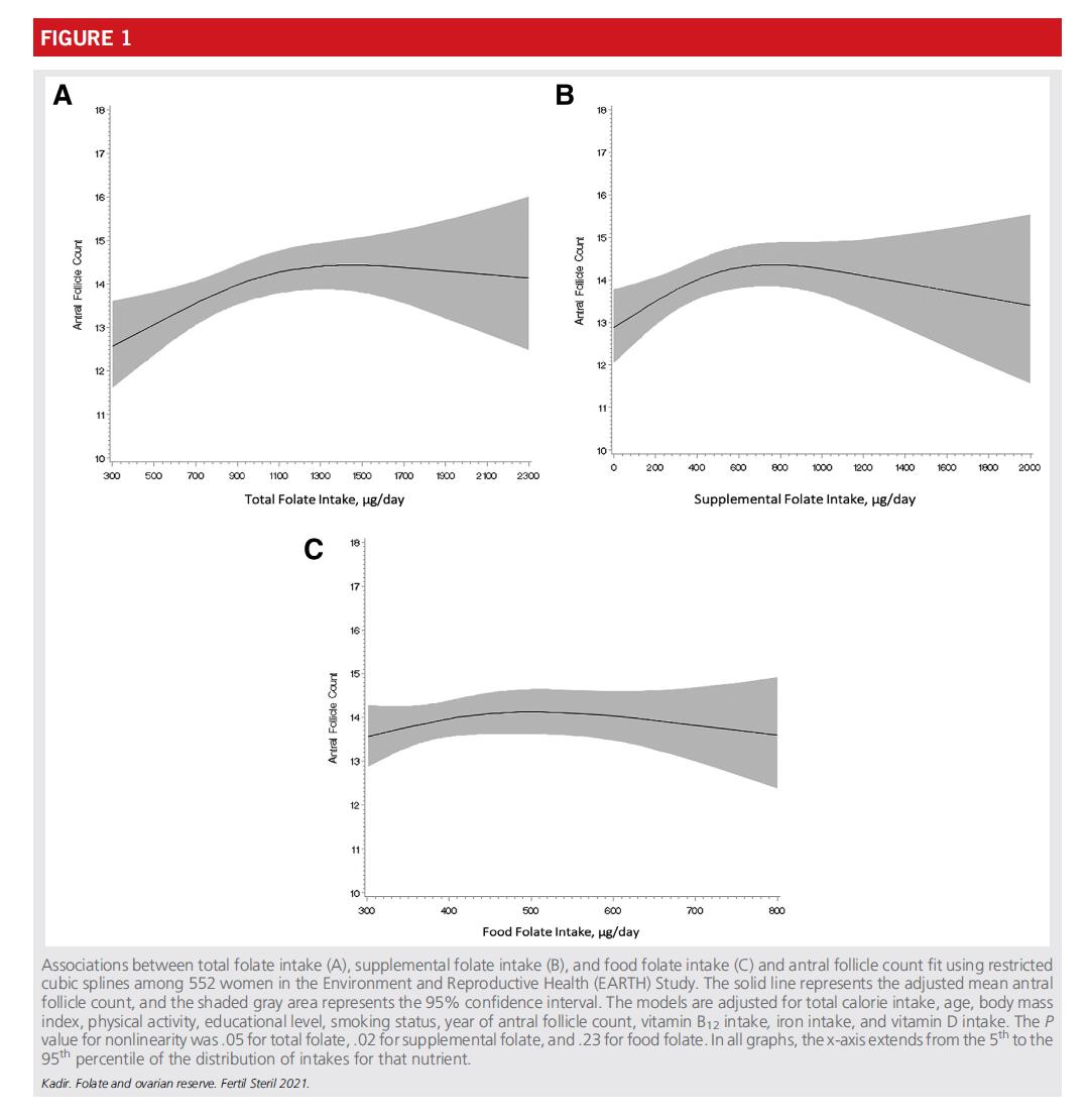 Los datos indicaron que la correlación positiva entre La ingesta total de ácido fólico y el AFC alcanzan una meseta de aproximadamente1200 microgramos por día. El beneficio máximo de la ingesta de ácido fólico proveniente de suplementos (ácido fólico sintético ácido fólico) ocurre aproximadamente800 microgramos por día. En comparación con las mujeres con un diario ingesta de 400 microgramos de ácido fólico, aquellos que consumen 800 microgramos por día Se espera que tenga un aumento de aproximadamente1,5 folículos.
