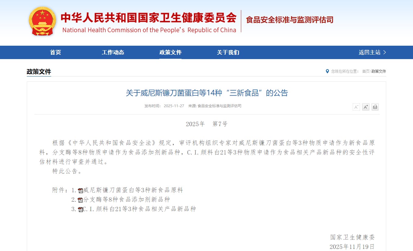 [1] Comisión Nacional de Salud de la República Popular China.Anuncio sobre 14 "Tres nuevos alimentos", incluida la proteína veneciana de fusarium (2025, N° 7).