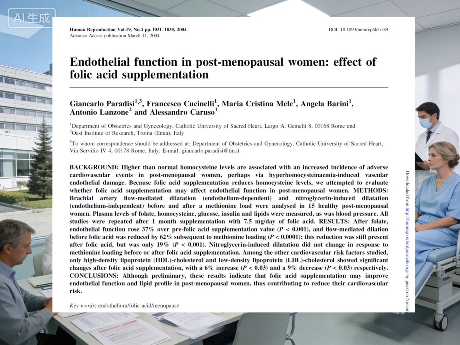 un estudio histórico de 2004 publicado en Reproducción humana (SI 6.1) por Giancarlo Paradisi, Francesco Cucinelli y sus colegas se centraron específicamente en mujeres posmenopáusicas. Quince participantes sanos, representativos de la típica estado posmenopáusico, tomó 7,5 mg/día de Ácido fólico durante un mes. Los resultados mostraron mejoras marcadas: