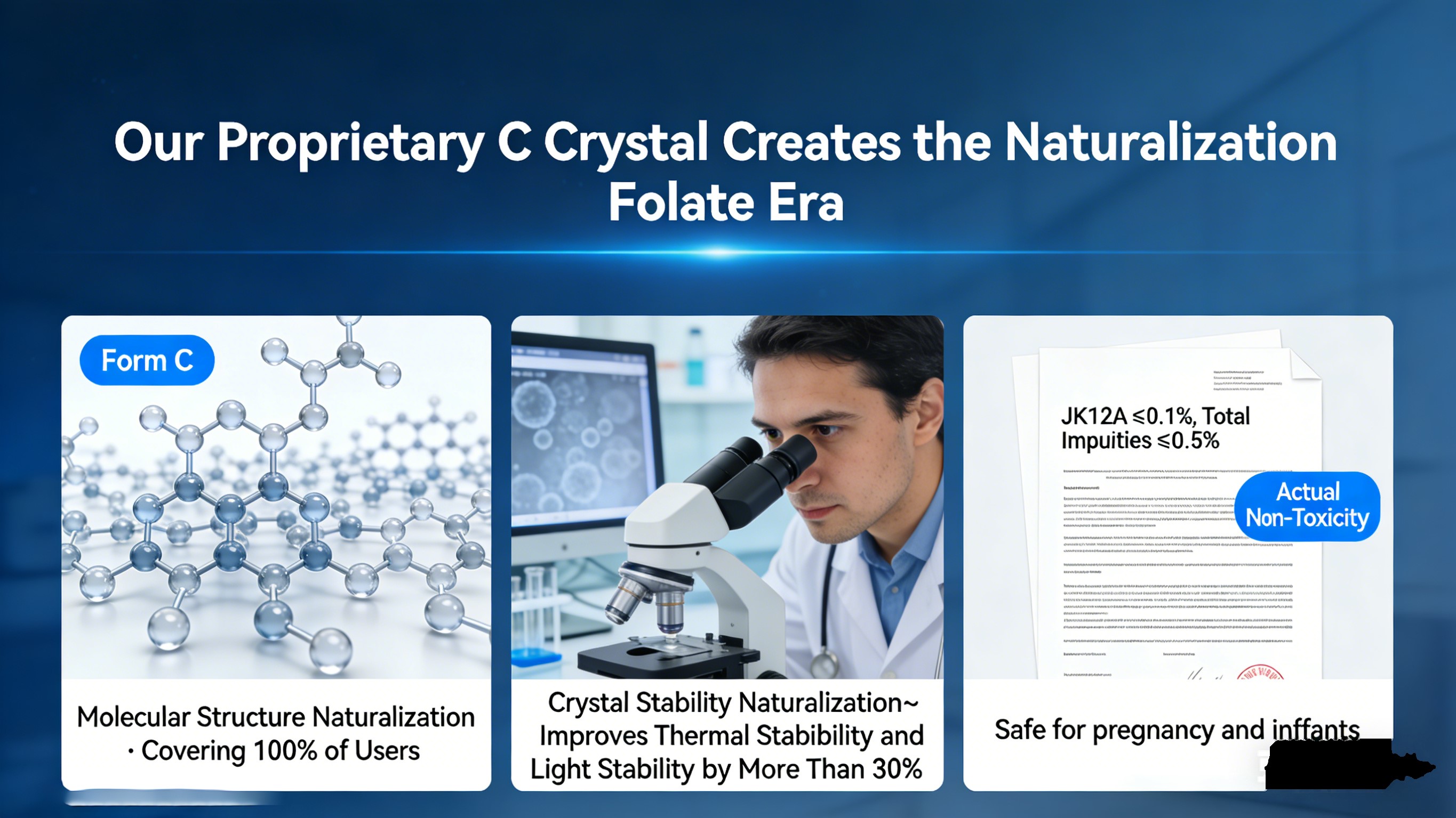 Basándonos en nuestra patente de cristal C, fuimos pioneros en el Categoría “Naturalización de folato”, obteniendo la primera certificación mundial. Verdadero La naturalización del folato requiere cumplir tres criterios básicos, claramente distinguiéndolo del folato activo de cristal I genérico: