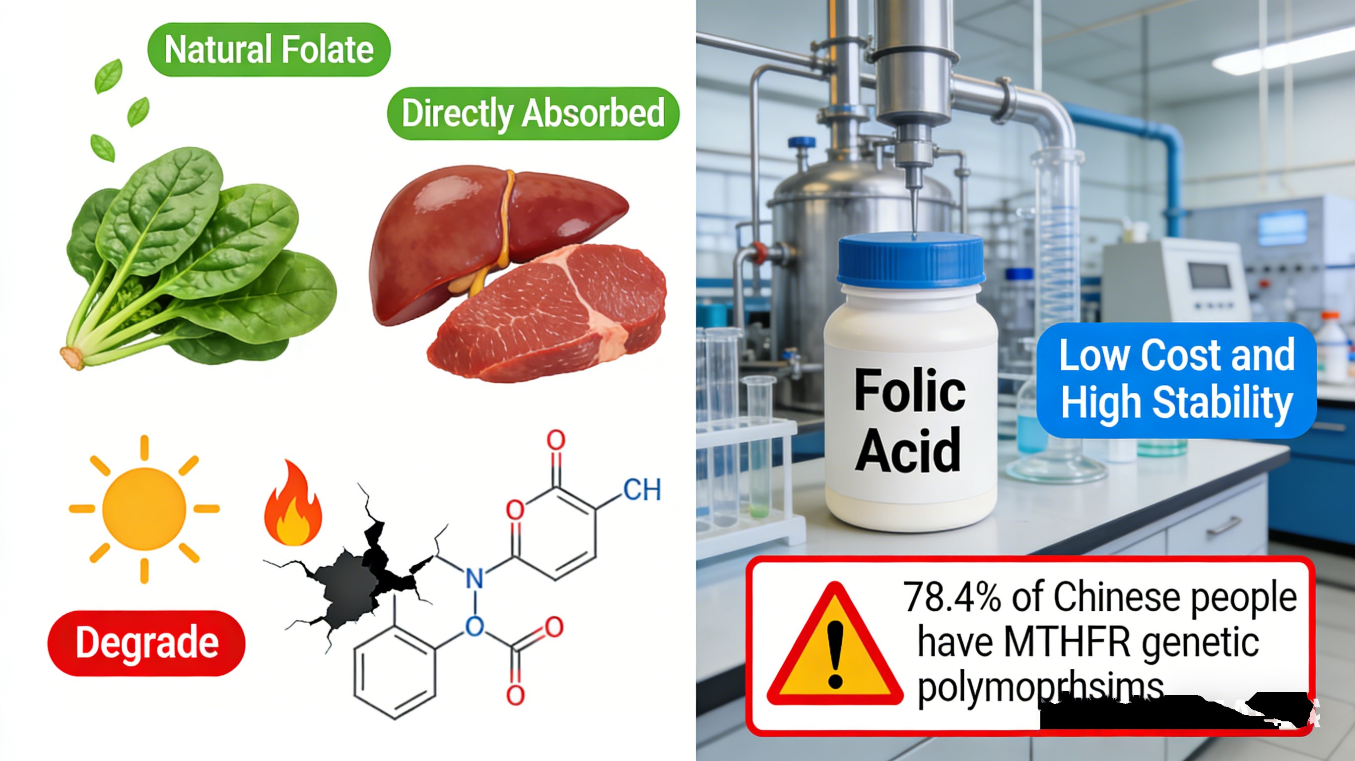 En 1945 se creó el ácido pteroilmonoglutámico sintético (fólico). ácido, se desarrolló, remodelando la industria. Su estructura oxidada es extremadamente estable, barato de producir y escalable, resolviendo los problemas de folato natural barrera de producción en masa. Durante medio siglo, el ácido fólico se convirtió en el medicamento mundial corriente principal;80 países y regiones ordenaron su fortificación en cereales. La mayoría de los suplementos de folato y los alimentos enriquecidos contienen ácido fólico.