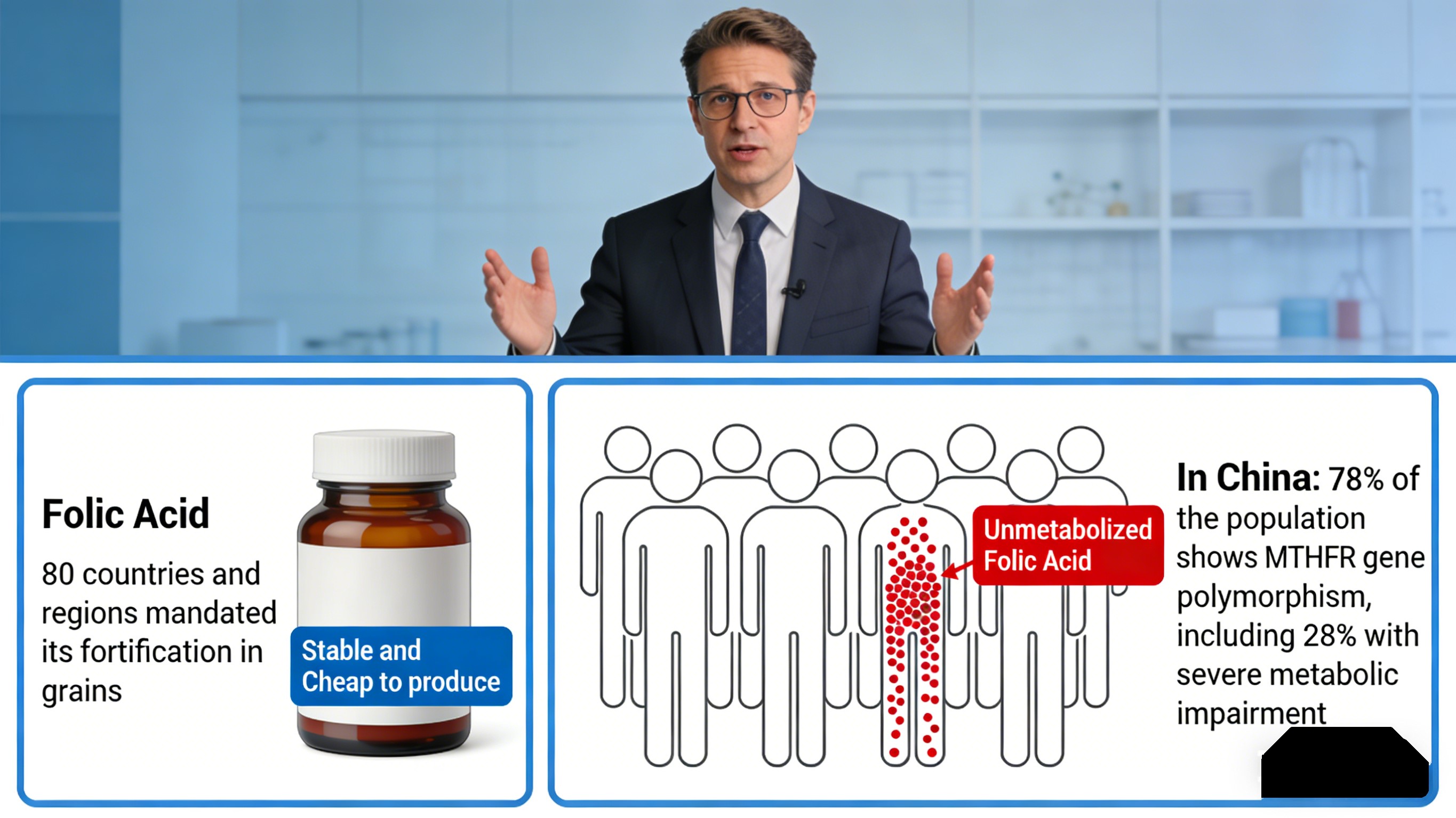 En términos prácticos, casi el 30% de los chinos no puede convertir eficientemente el ácido fólico, lo que lleva a una suplementación ineficaz y posible acumulación de ácido fólico no metabolizado, que puede enmascarar la deficiencia de vitamina B12 e interferir con la absorción de zinc. Para las empresas, esto se traduce en quejas de los consumidores y riesgo reputacional.