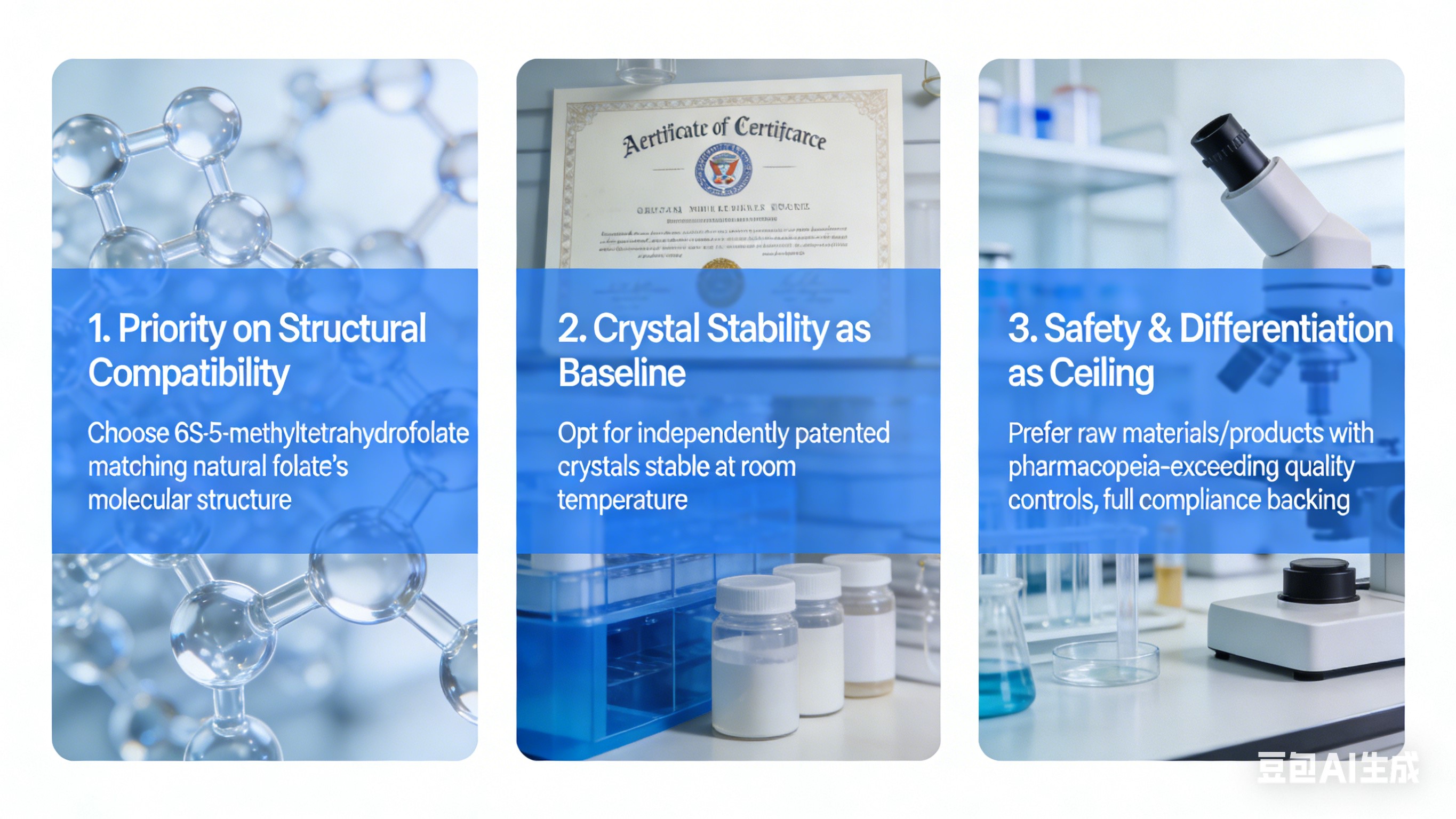 1. Prioridad a la compatibilidad estructural: Elija la combinación de 6S-5-metiltetrahidrofolato estructura molecular del folato natural: absorción directa, cubre todo usuarios, previene la ineficacia.2. Estabilidad del cristal como punto de partida: Opte por cristales estables patentados de forma independiente a temperatura ambiente para garantizar la consistencia del lote y la etiqueta cumplimiento.